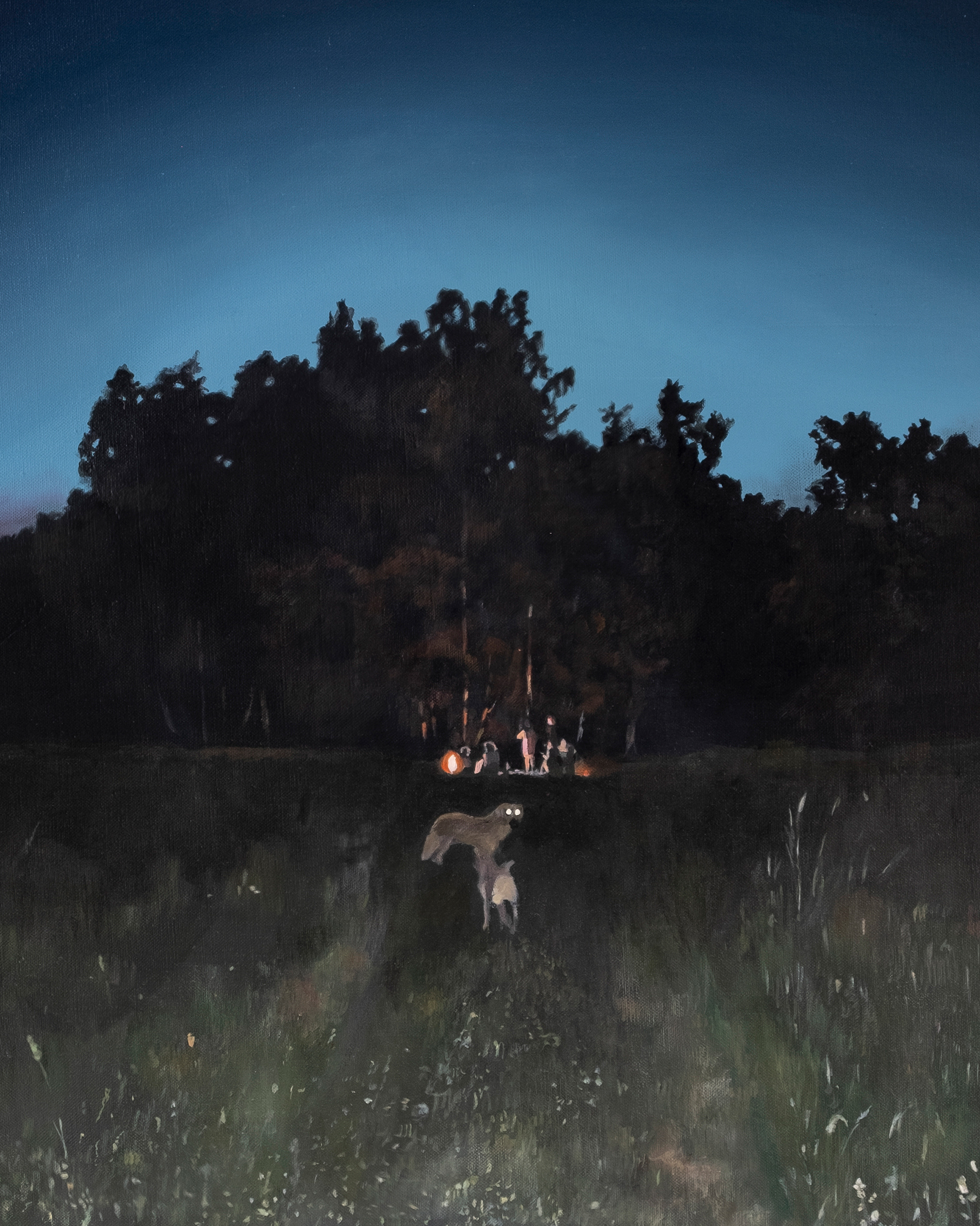 "A Meadow, Dogs and a Bonfire", 2022, akryl na płótnie, 80x90cm